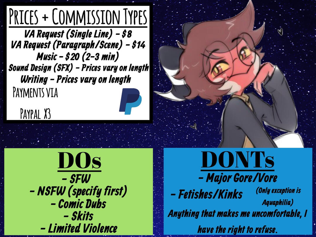 Hello there! I'm the user known as Nerdy Kai, but you can just call me Kai. I'm a content creator up on YouTube that does Comic Dubs, Gaming, Unboxing, etc. I've been in the business for 5+ years and I'm always happy to help out or collaborate in projects! I got a degree in Fine Arts (with knowledge of computer tech stuff), and have worked with many folks in the past.Below you can find my commissions on the terms of VA work, Sound Edits, etc; as well as art commissions and ways of payment.Let's make something together! :3
